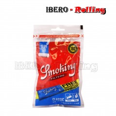Los filtros tiene como objetivo filtrar partículas toxicas del humo que se desprenden al quemarse haciéndolo menos nocivo para el fumador. Los filtros Smoking slim bolsa de 180 unidades con un librillo de smoking blue 70mm tiene una textura lisa gracias al papel que lo envuelve, son los clásicos filtros slim de Smoking ideales para los que prefieren cigarrillos mas delgados. La bolsa tiene un cierre Zip para que nuestra bolsa quede bien sellado y no perdamos los filtros abitando así también que cojan humedad.